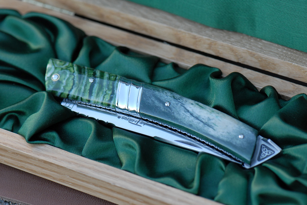 Le Thiers® à pompe, mitre centrale inox, en molaire de mammouth vert et os de girafe stabilisé vert.