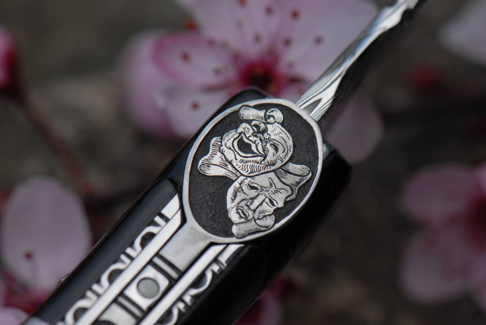 Laguiole 12 cm 1P avec une sculpture de Mascaron en cœur de mammouth, et le manche en pointe de corne noire terminé par une tulipe.