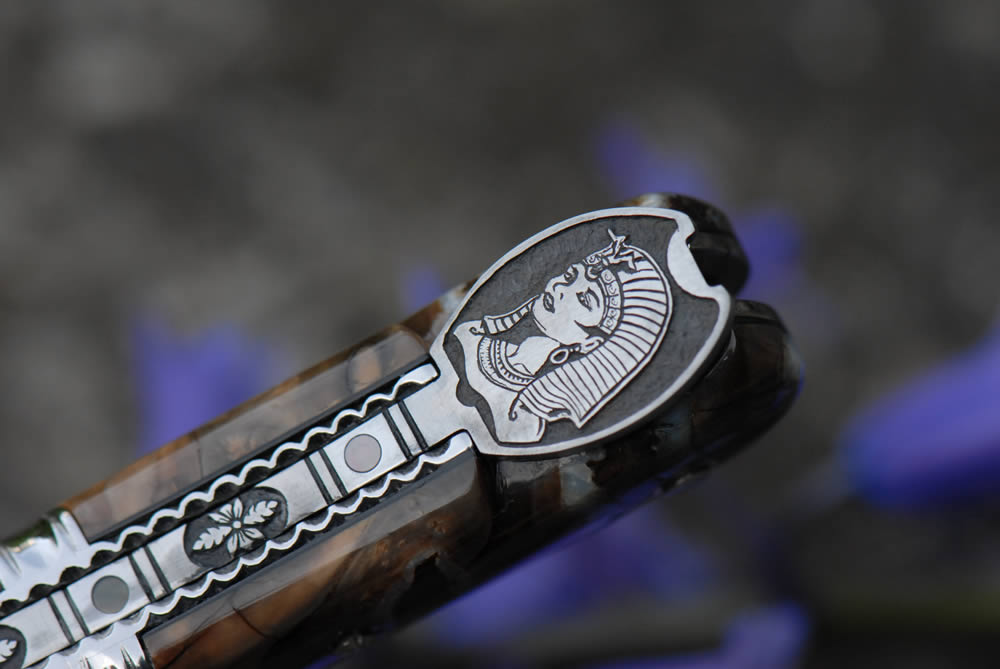 Laguiole 12 cm 1 pièce plein manche "Aile de Cygne " en croûte de mammouth, sculpture d’un Mascaron et d’une tête d’un vieillard sculpté dans le manche.