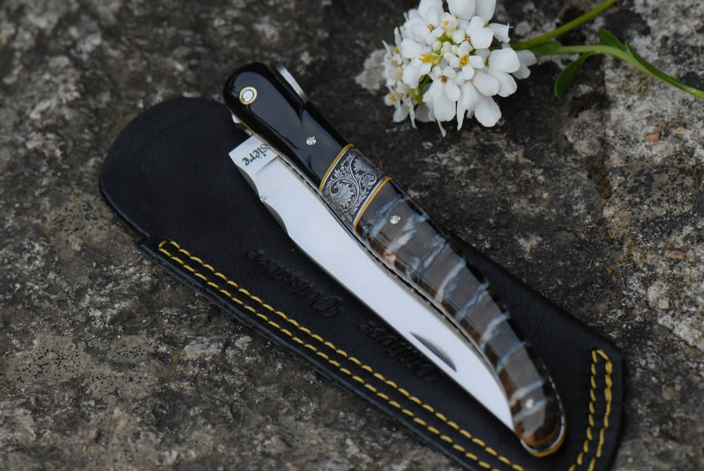 Laguiole 12 cm 1 pièce plein manche en cœur de mammouth, sculpture style "Crocombette".