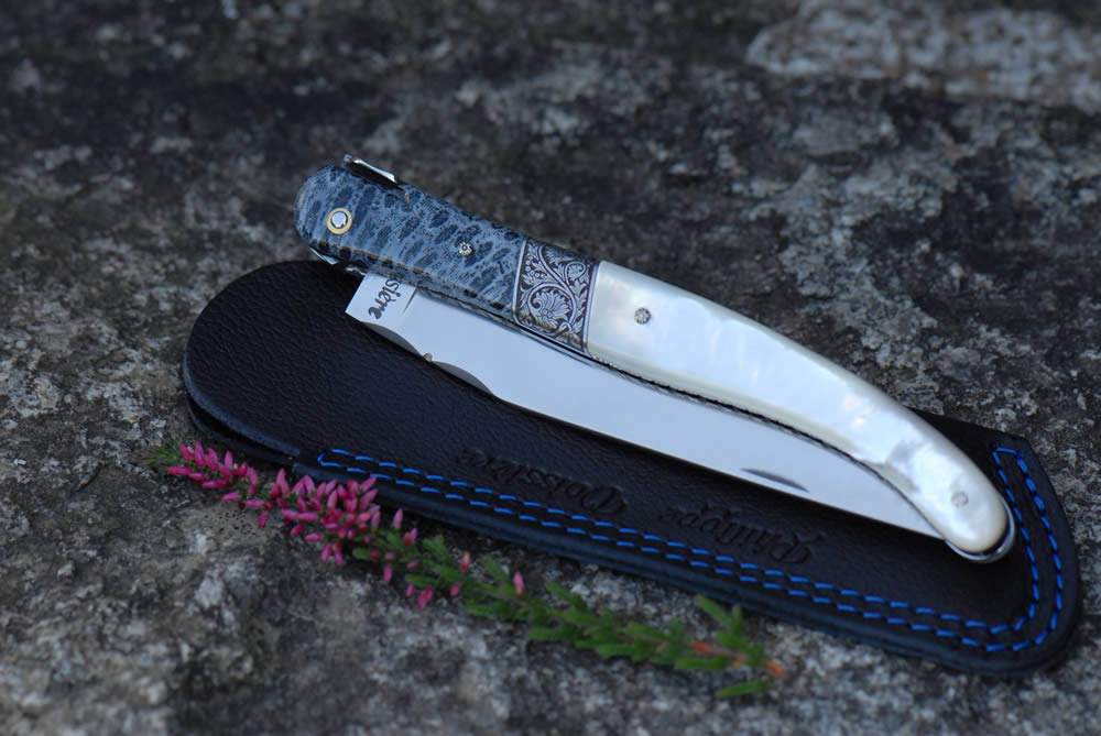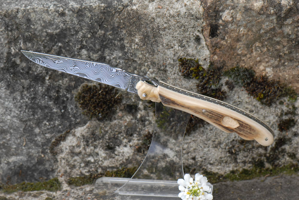La lame est en Damas carbone avec un tranchant rapporté de Jean-Pierre Veysseyre.