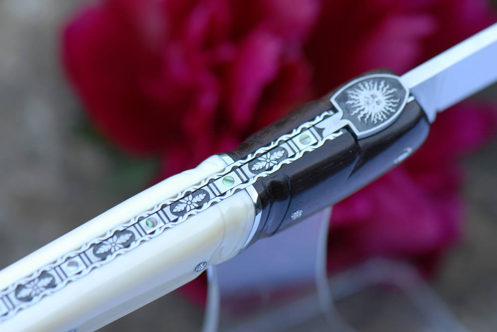 Laguiole 12cm 1 pièce plein manche "Aile de Cygne" en croûte de mammouth, sculpture d’une « Marianne » et d’une tête d’un vieillard sculptés dans le manche.
