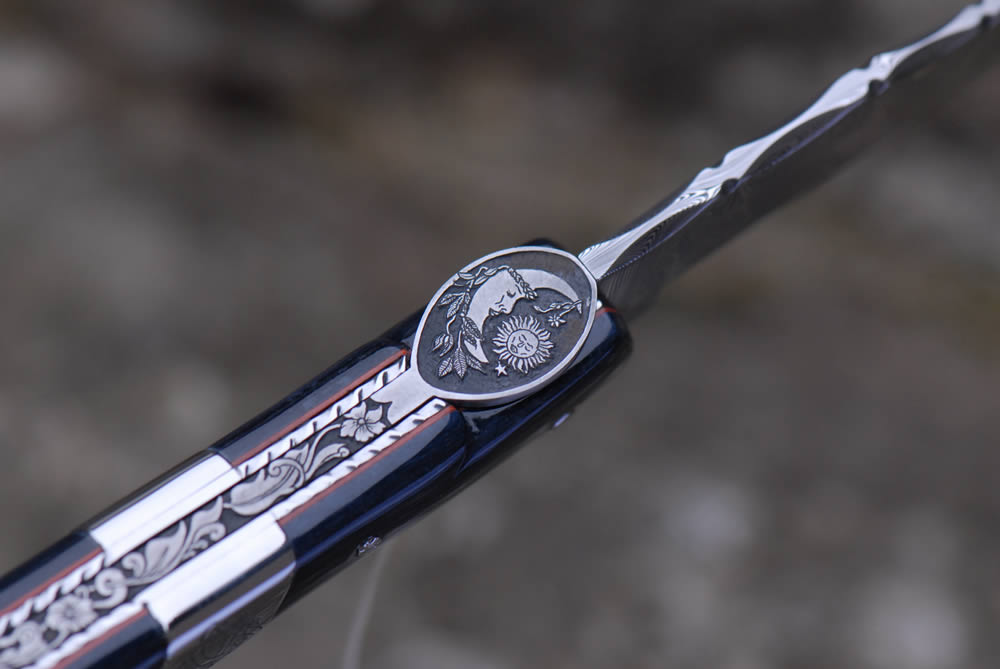 Sculpture d’une tête de "Marianne" sur le devant du couteau, et sculpture d’une tête d’un "Vieillard" sur un coté.