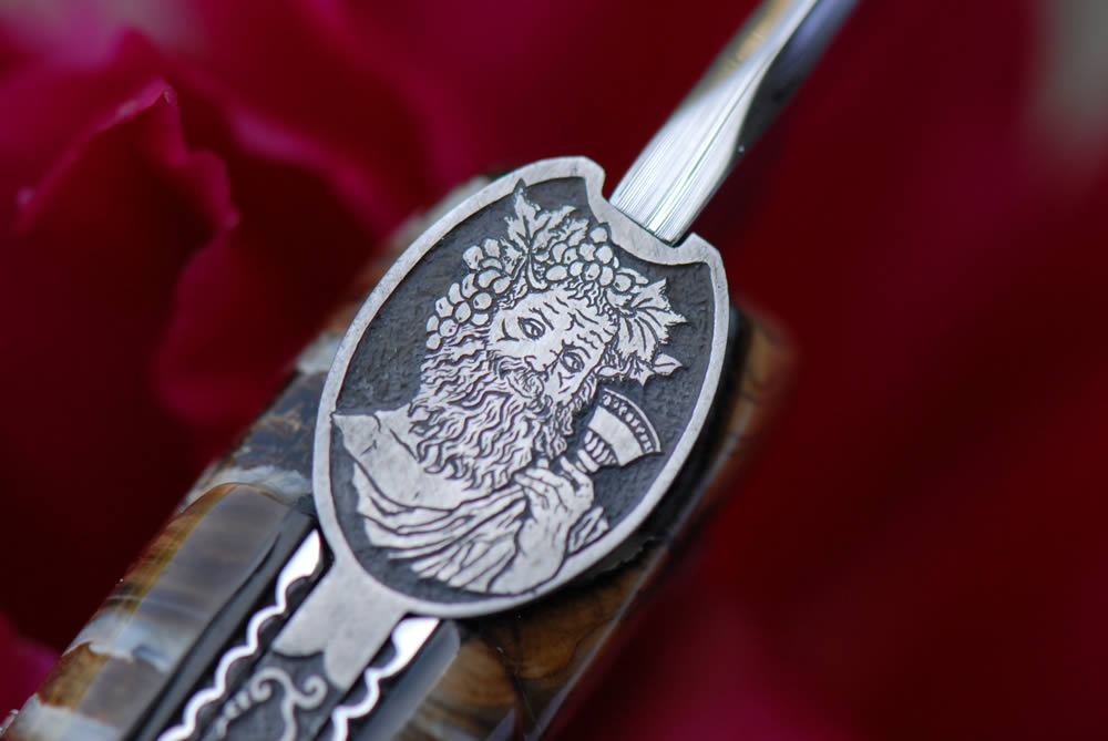 Gravure de Bacchus dans un cartouche à la place de l’abeille, le ressort est gravé au motif d’une vigne.