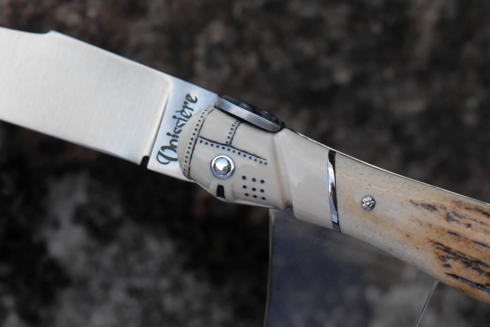 Laguiole 12cm 1 pièce mitre centrale, en cœur de mammouth et buffle, les mitres sont gravées d’un œil de la providence.