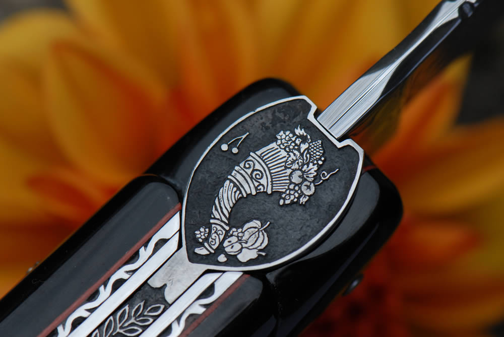 Gravure de la "Panthère" à la place de l’abeille, le ressort avec des incrustations de nacre et des gravure d’empreintes de pattes et de diamant.