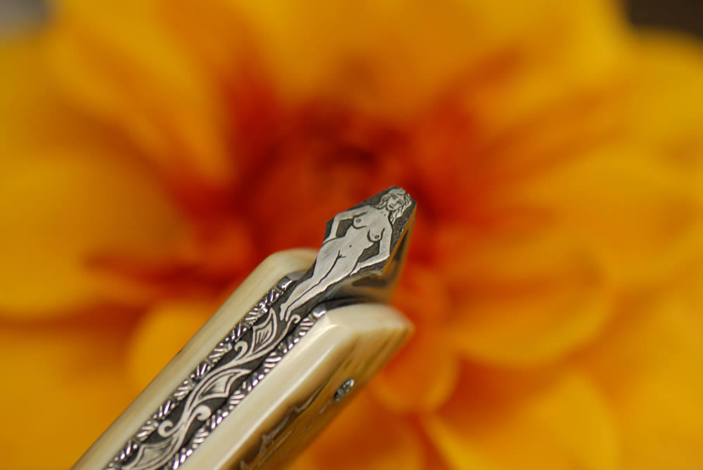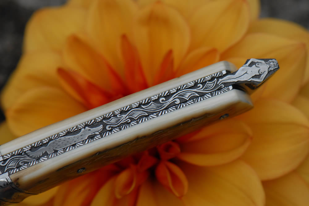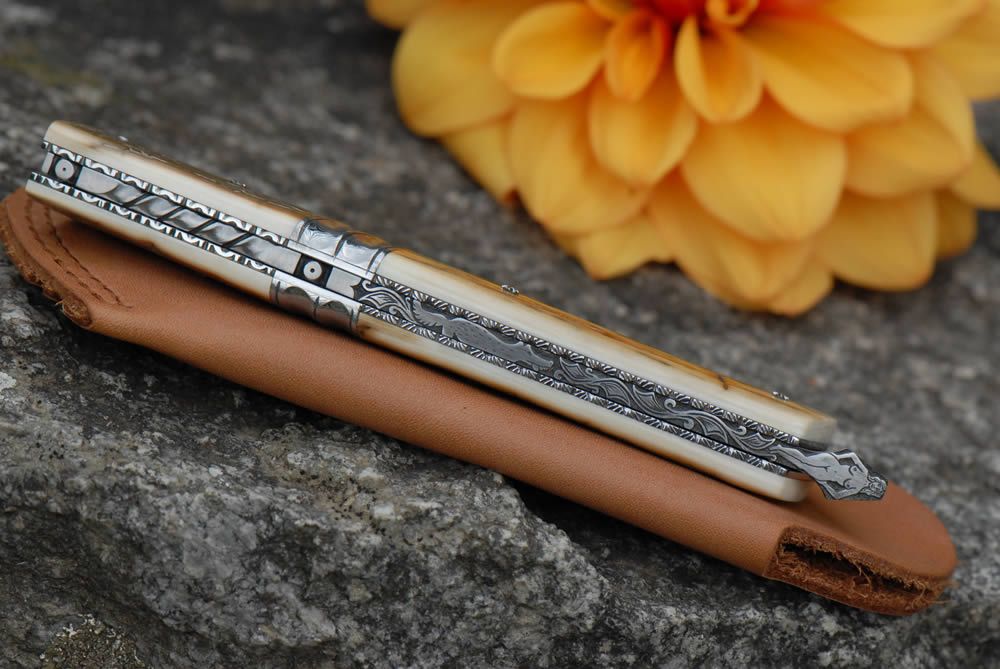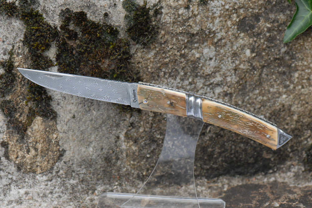 Le Thiers® à pompe, mitre centrale en Damasteel, manche en croûte de mammouth.