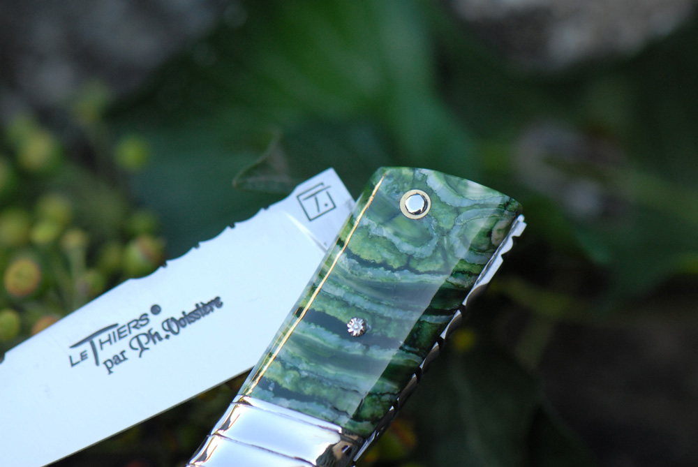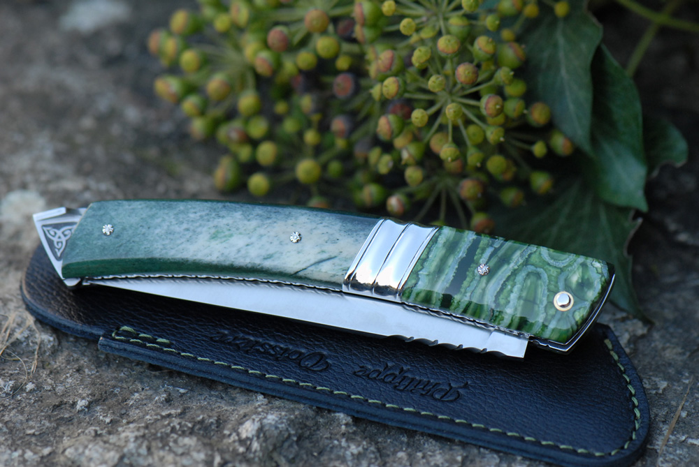 Le Thiers® à pompe, mitre centrale inox, en molaire de mammouth vert et os de girafe stabilisé vert.