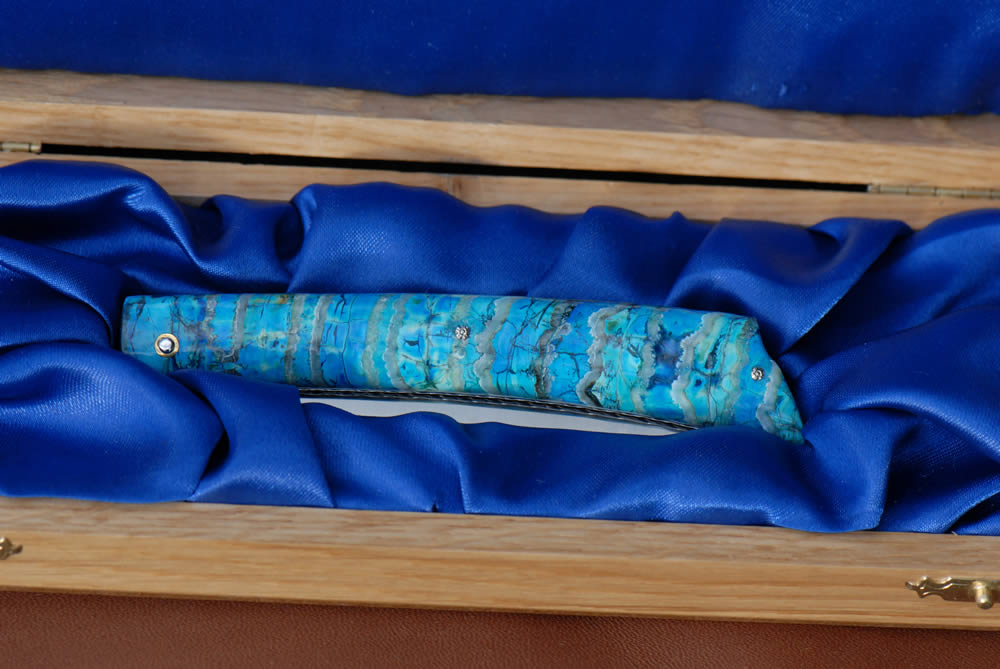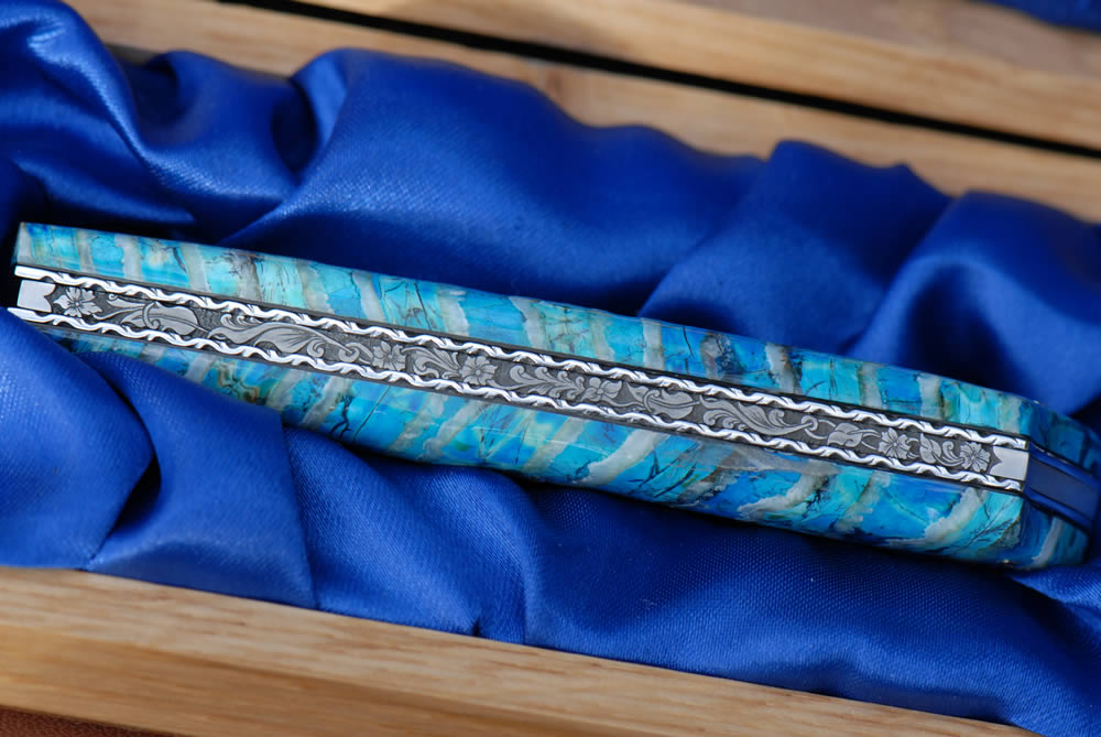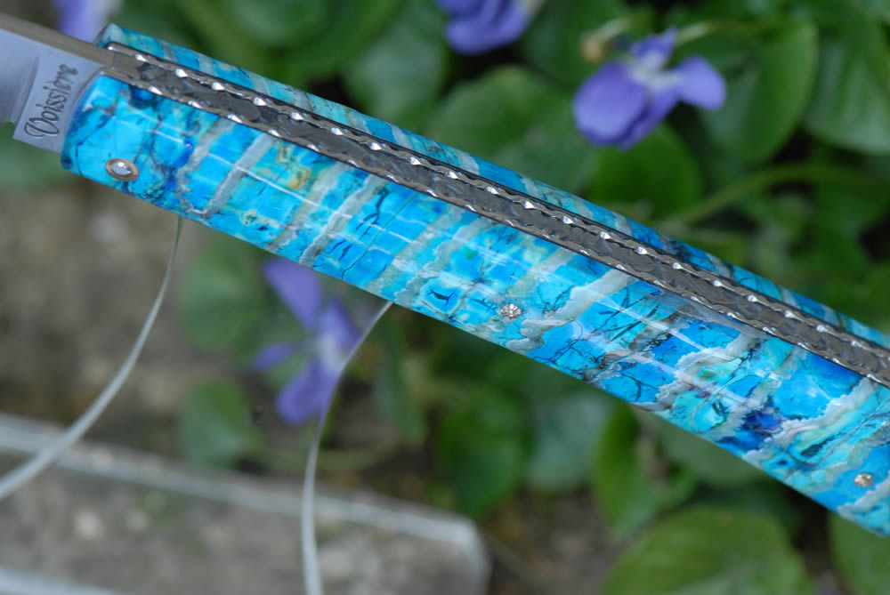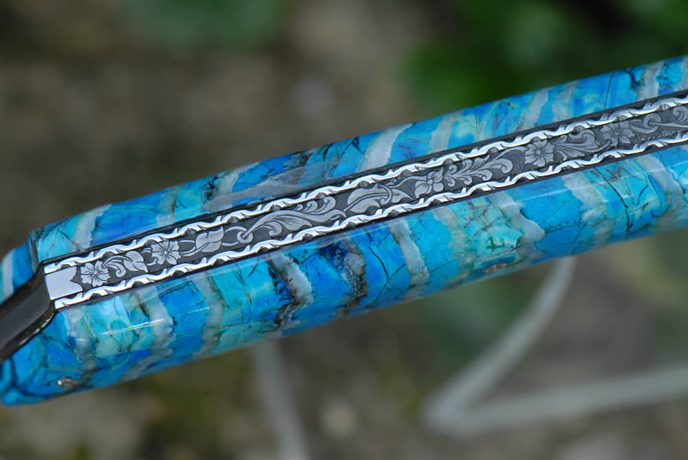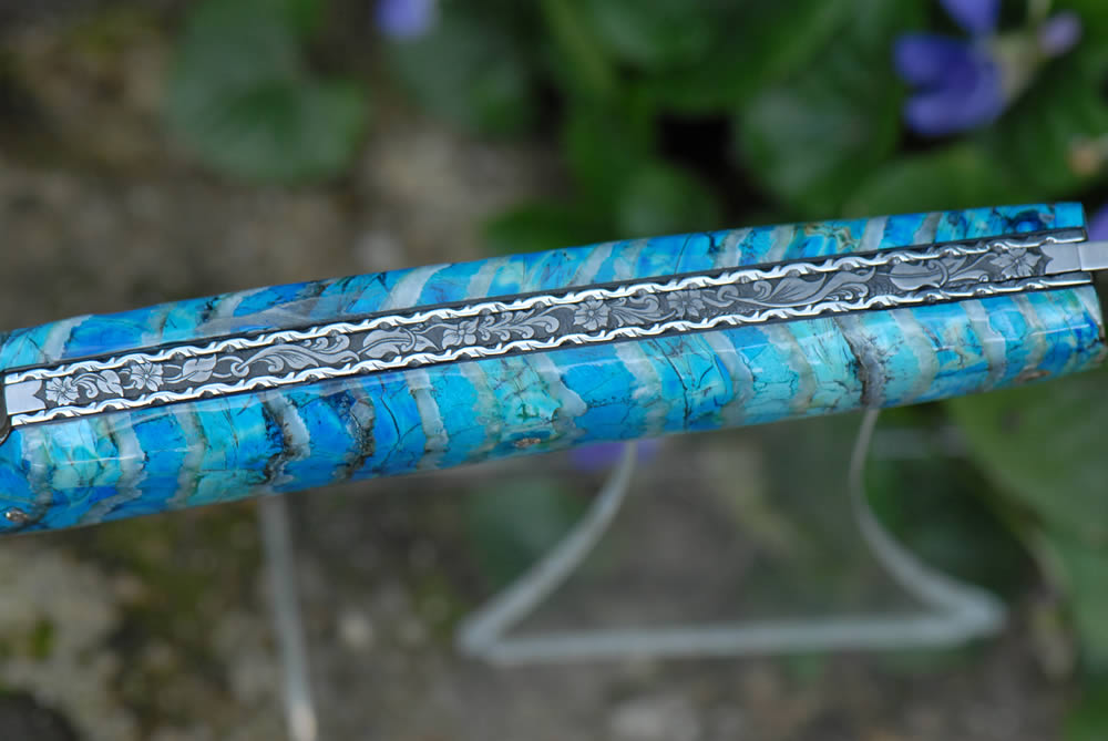 Mandrin 12cm 1 pièce plein manche en molaire de mammouth bleu. Lame 12c27. Gravure "fleur baroque" sur le ressort.