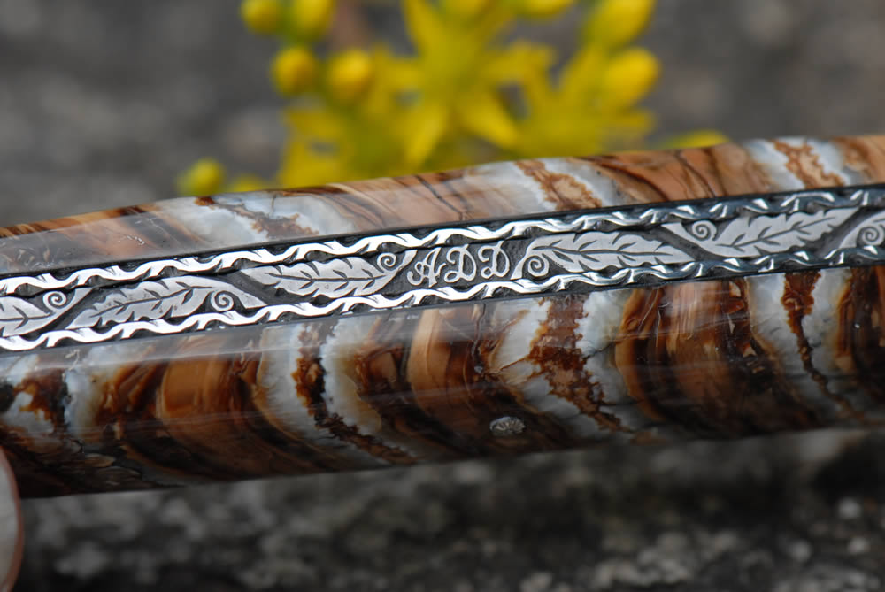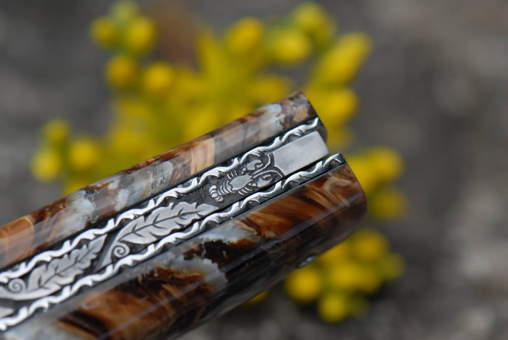 Gravure d’un "Homard" aux extrémités du ressort, des initiales aux centre et des feuilles entre les deux.