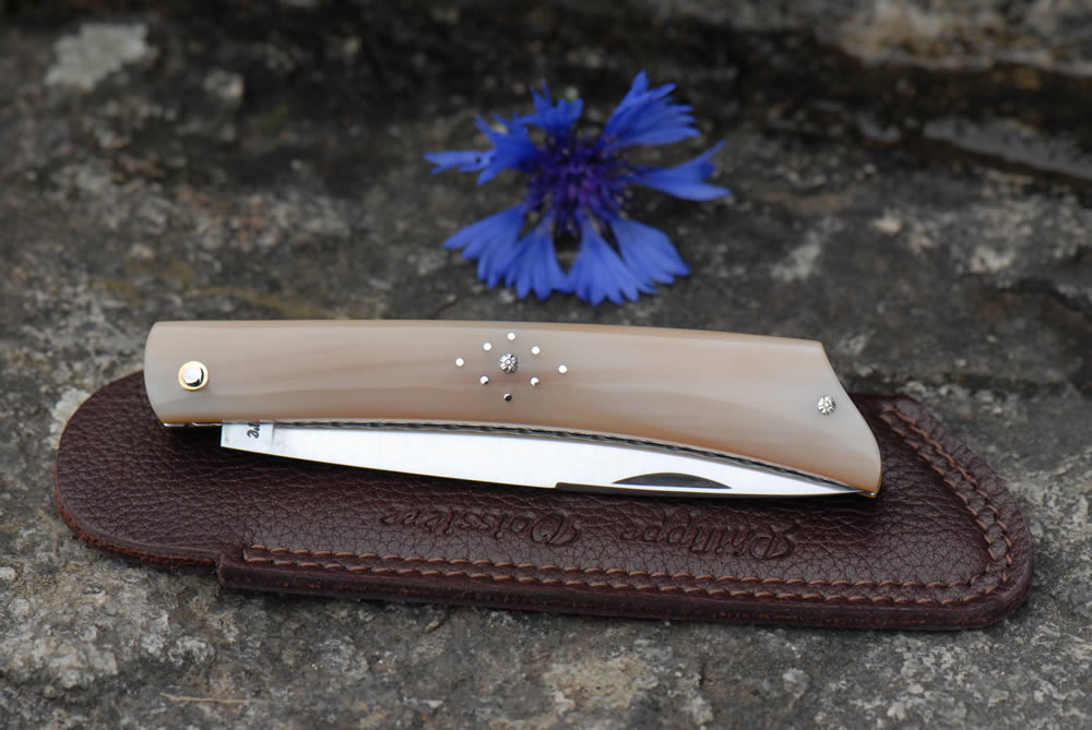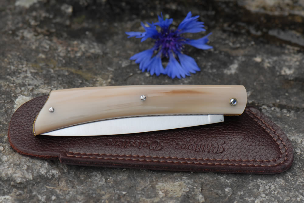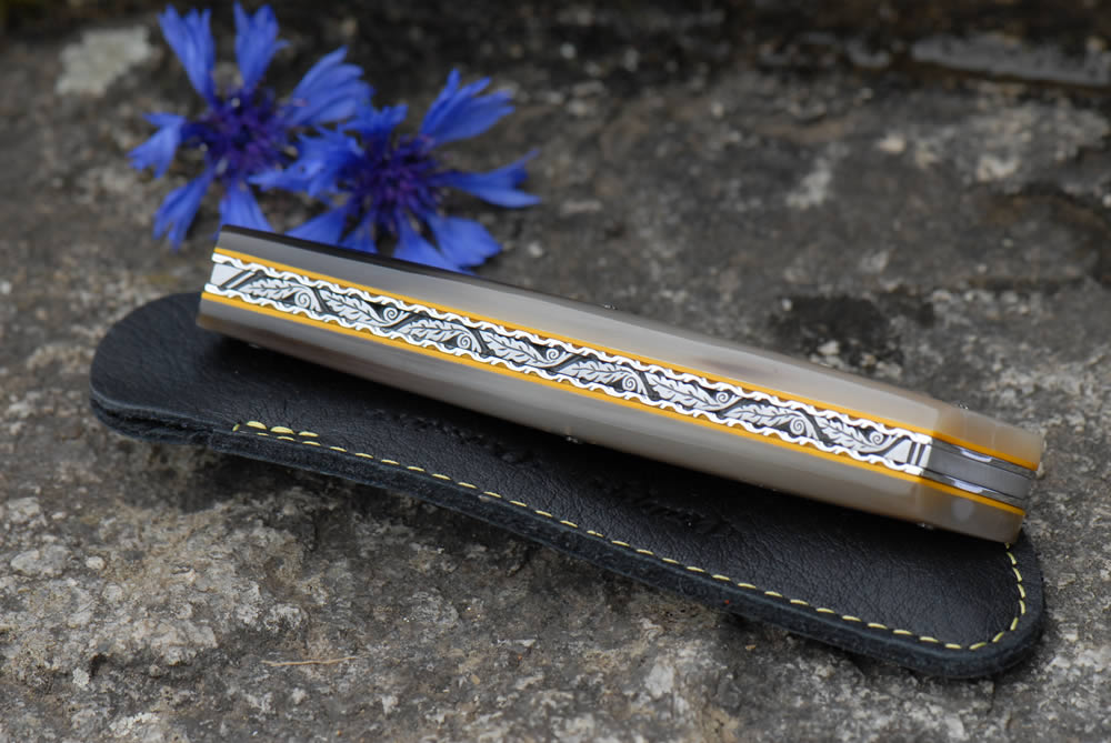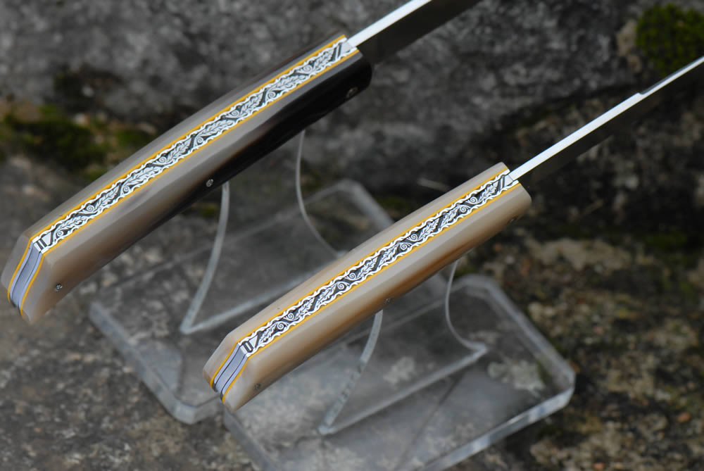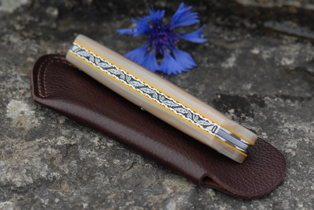 Mandrin 10cm et 12cm 1 pièce plein manche en pointe de corne blonde avec un intercalaire jaune, et un festonnage en forme de losange sur une cote.