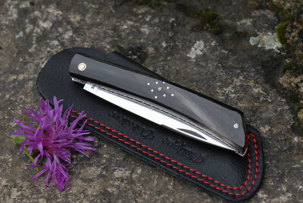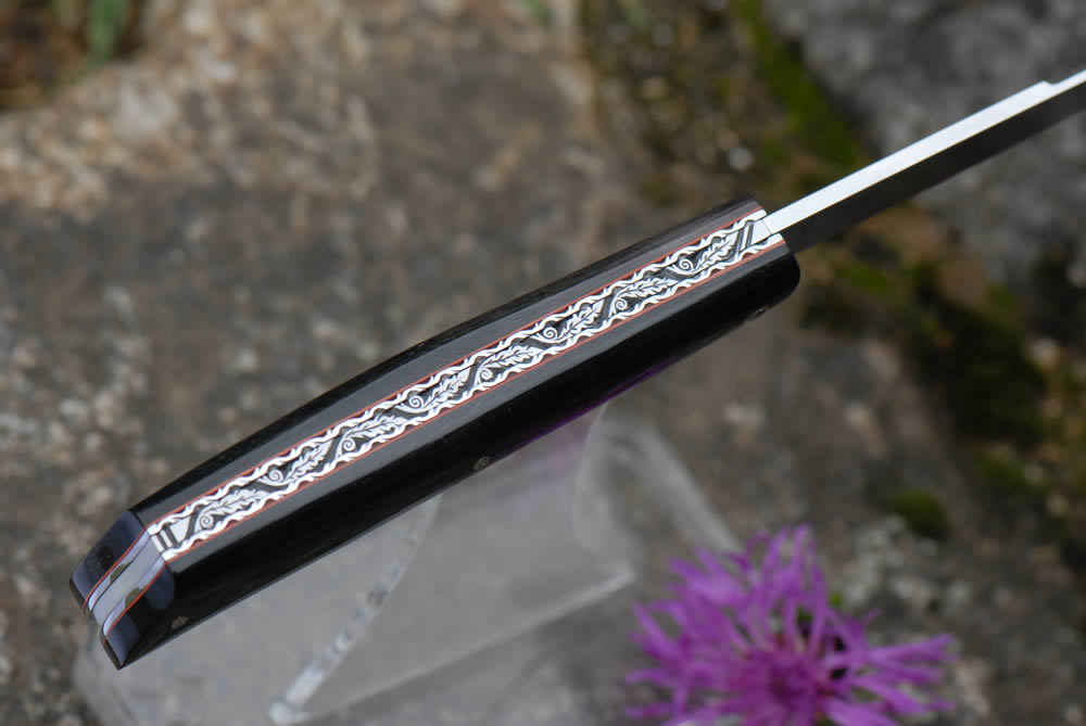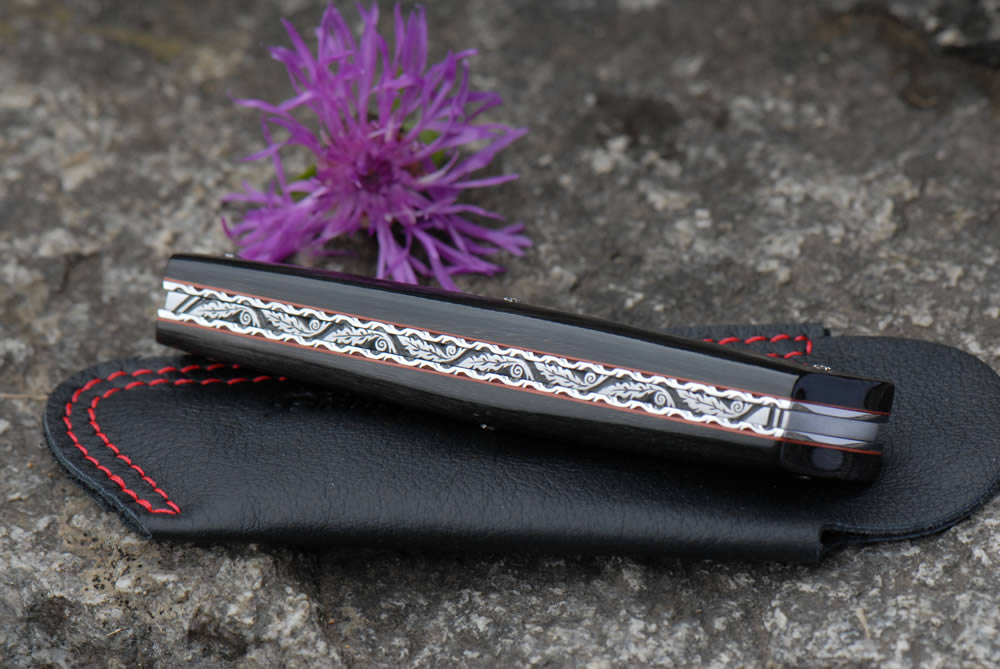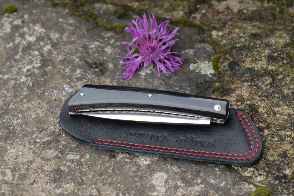 Mandrin 10cm et 12cm 1 pièce, plein manche en pointe de corne noire avec un intercalaire rouge, et un festonnage en forme de losange sur une cote.